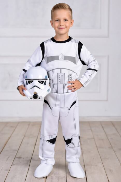 В комплект входить білий комбінезон із реалістичним принтом броні, об’ємні вставки з піноматеріалу, пластикова маска з сіткою для очей та м’які бахіли з еластичними ремінцями. Матеріали — легкий поліестер і поліуретанова піна, що дозволяє вільно рухатися й залишатися у комфорті навіть під час активних ігор.